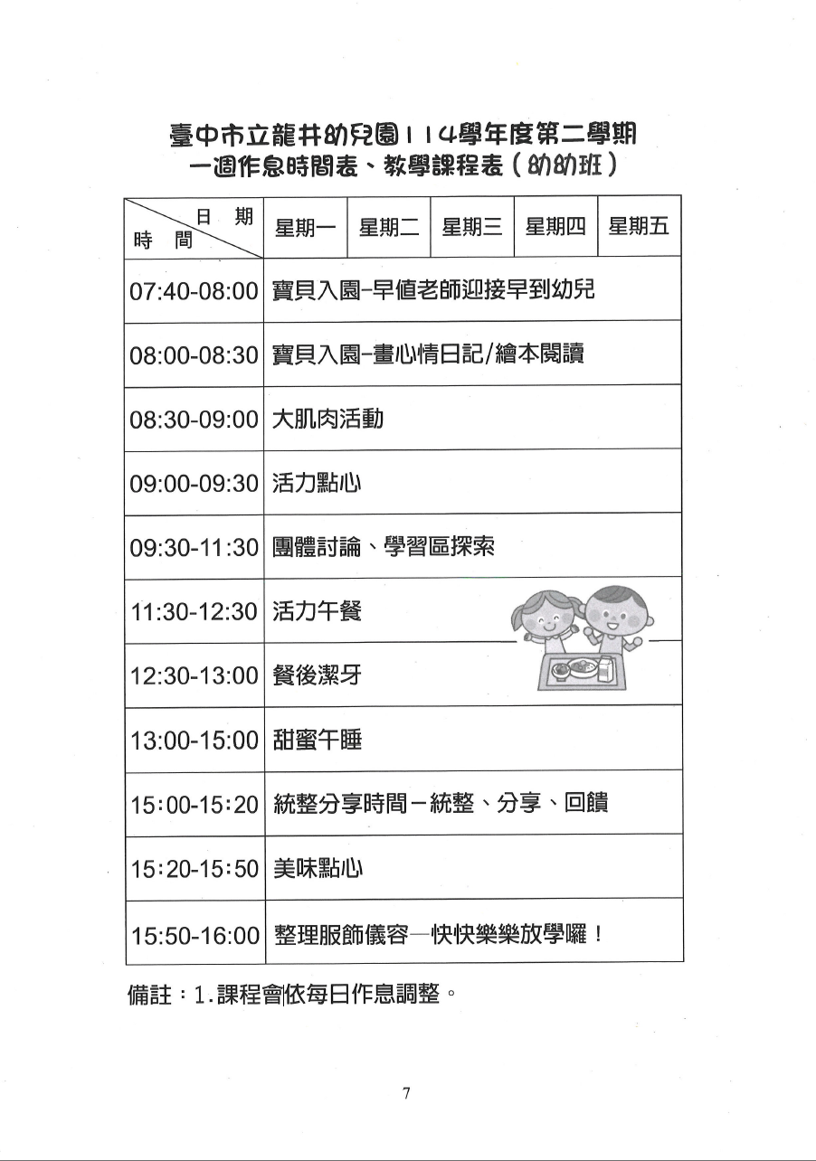 臺中市立龍井幼兒園114學年度第二學期一週作息時間表-教學課程表-大-中-小-幼幼班