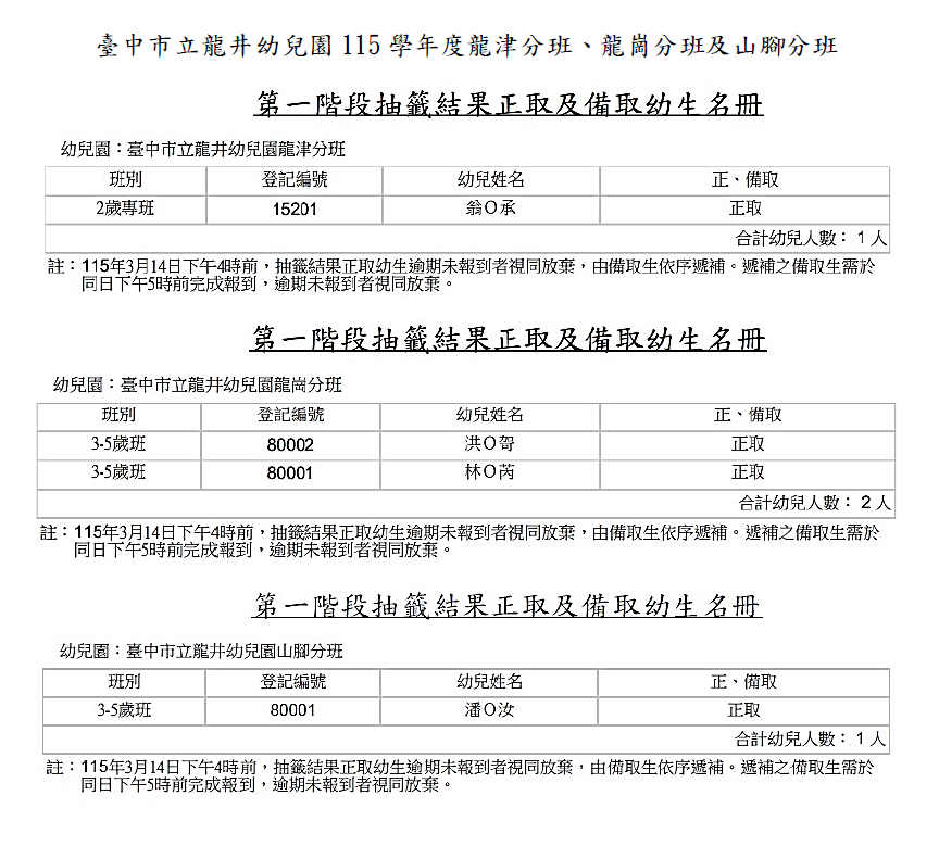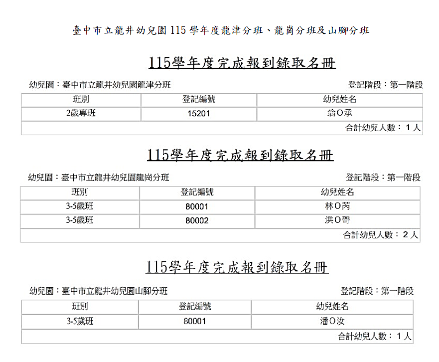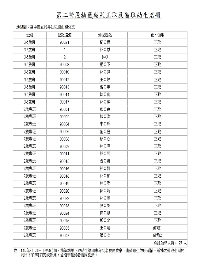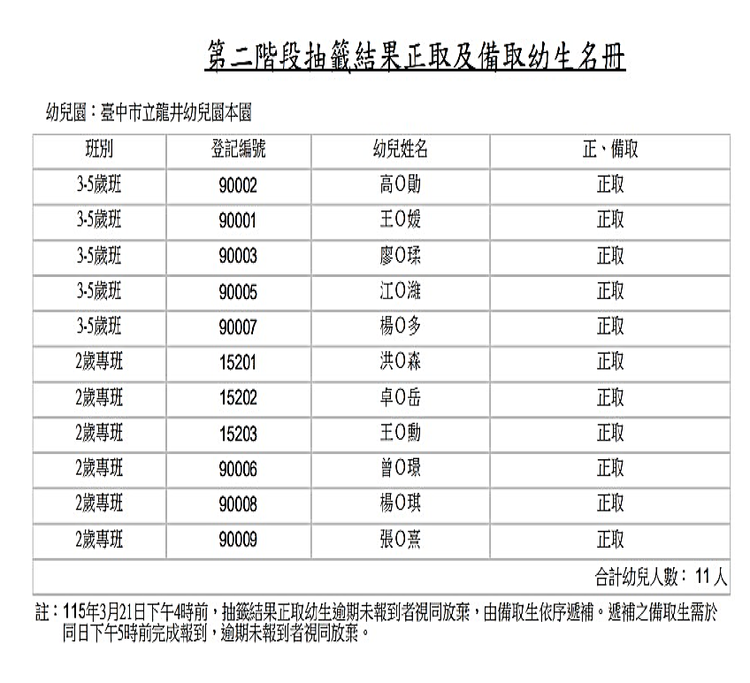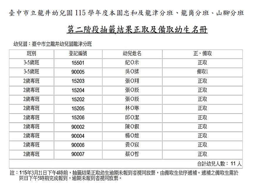 臺中市立龍井幼兒園115學年度第二階段招生正備取名單